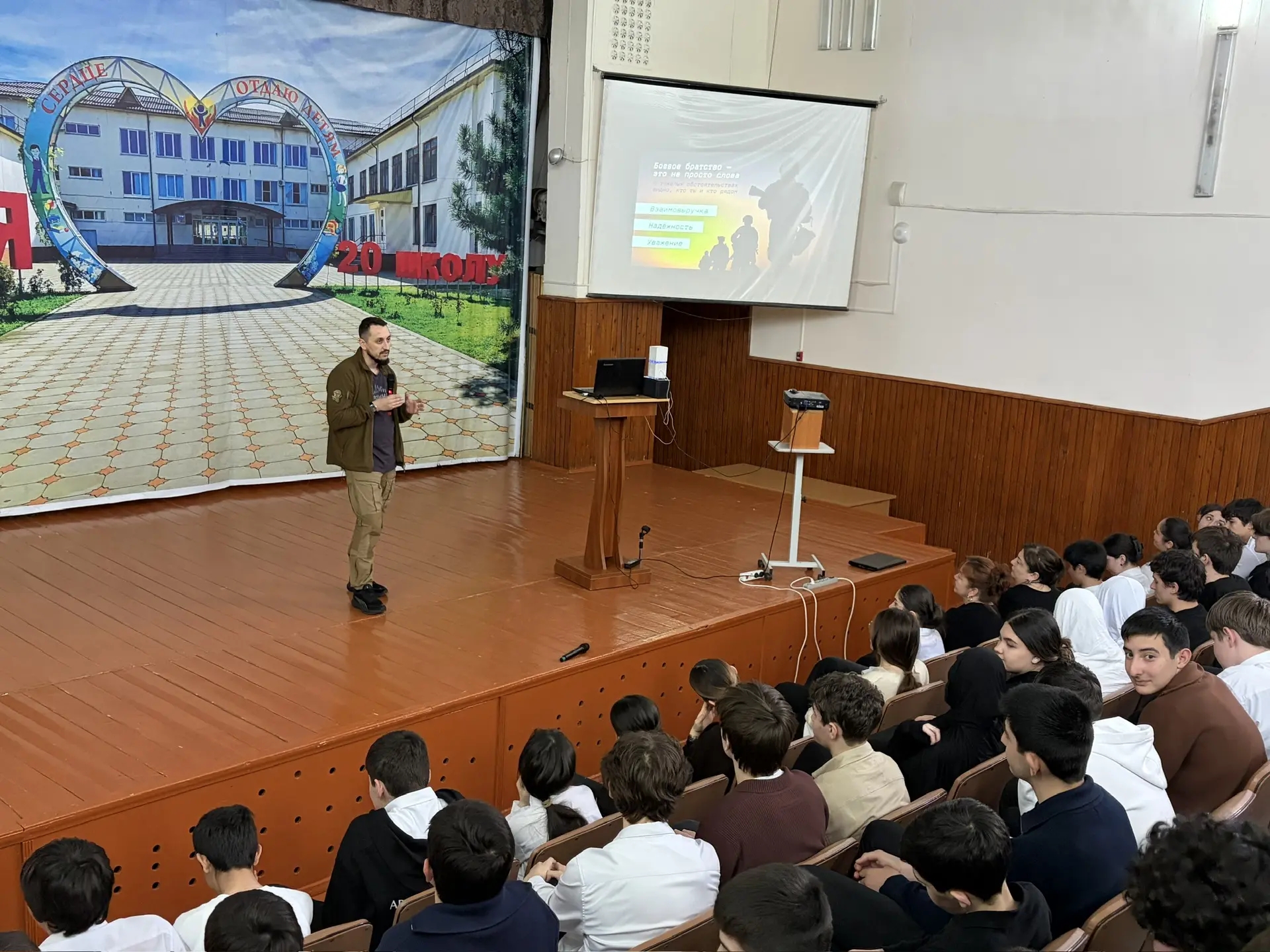 10 апреля 2026 г. в МКОУ "СОШ №20" г.о. Нальчик участник СВО, проекта "Герои Ямала" Халметов Руслан Наримбаевич провёл лекцию на тему "Путь защитника. Честь и верность". В форме открытого диалога прошло интересное и полезное общение по вопросам сохранения духовно-нравственных ценностей и укреплению гражданской идентичности молодого поколения.