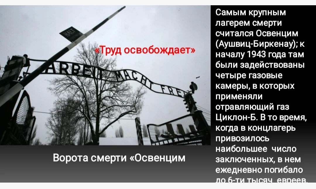 АУШВИЦ (ОСВЕНЦИМ) — крупнейший концентрационный лагерь и лагерь смерти, созданный нацистами в годы Второй мировой войны на территории оккупированной Польши. Комплекс включал три основных лагеря: Аушвиц I, Аушвиц II (Биркенау), Аушвиц III (Моновиц), а также около 50 филиалов. Аушвиц II (Биркенау), лагерь смерти, начали строить осенью 1941 года по распоряжению Генриха Гиммлера в деревне Бжезинка, в 3 км от Освенцима. С 1942 года он стал главным центром массового уничтожения евреев.