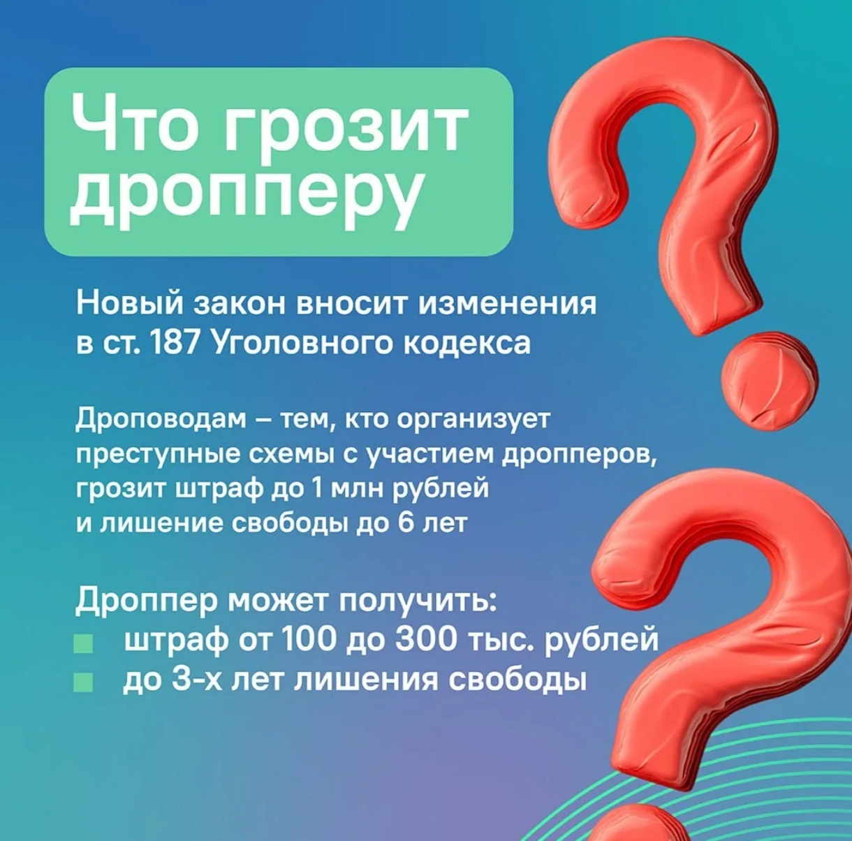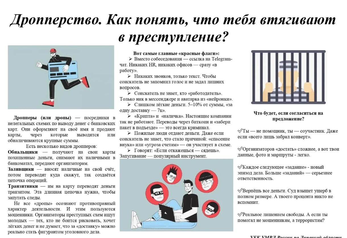Они рассказали школьникам о преступлениях под названием дропперство, пояснили, кто такие дропперы, как мошенники используют подростков в качестве курьеров и как не стать соучастником преступления. В ходе беседы инспектора ПДН объясняли ребятам, что основная задача дроппера — перевести мошенникам деньги на другой счет или обналичить и передать следующему участнику схемы. По закону дропперы считаются соучастниками мошенников. Чаще всего дропперами становятся школьники - подростки и студенты, которые нуждаются в деньгах. Открыть банковскую карту можно уже с 14 лет и преступники активно используют это обстоятельство, вовлекая молодых людей в незаконную деятельность.